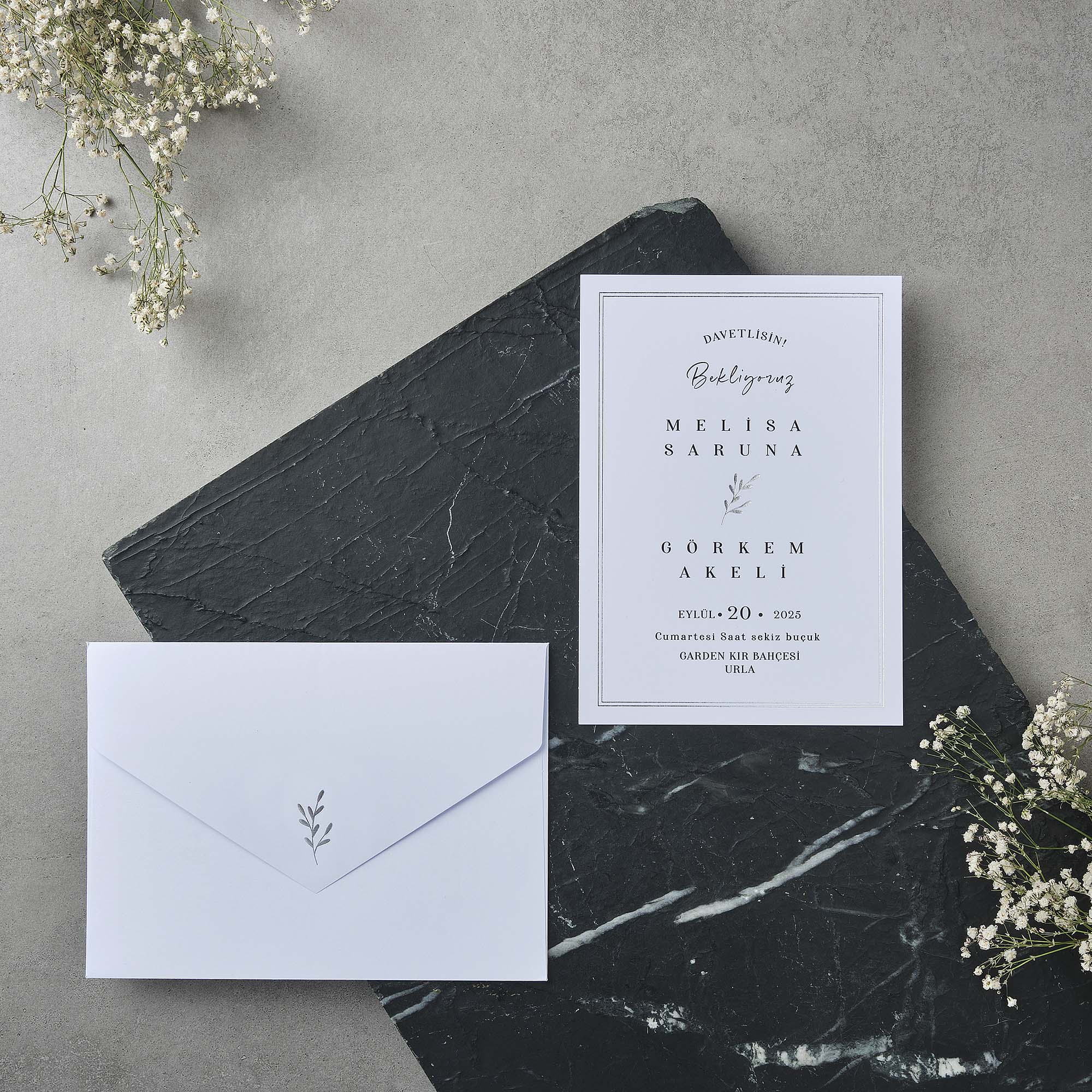 - Davetiye kutulu olarak tasarlanmış olup zarf ve aksesuarları içerisinde bulunmaktadır.