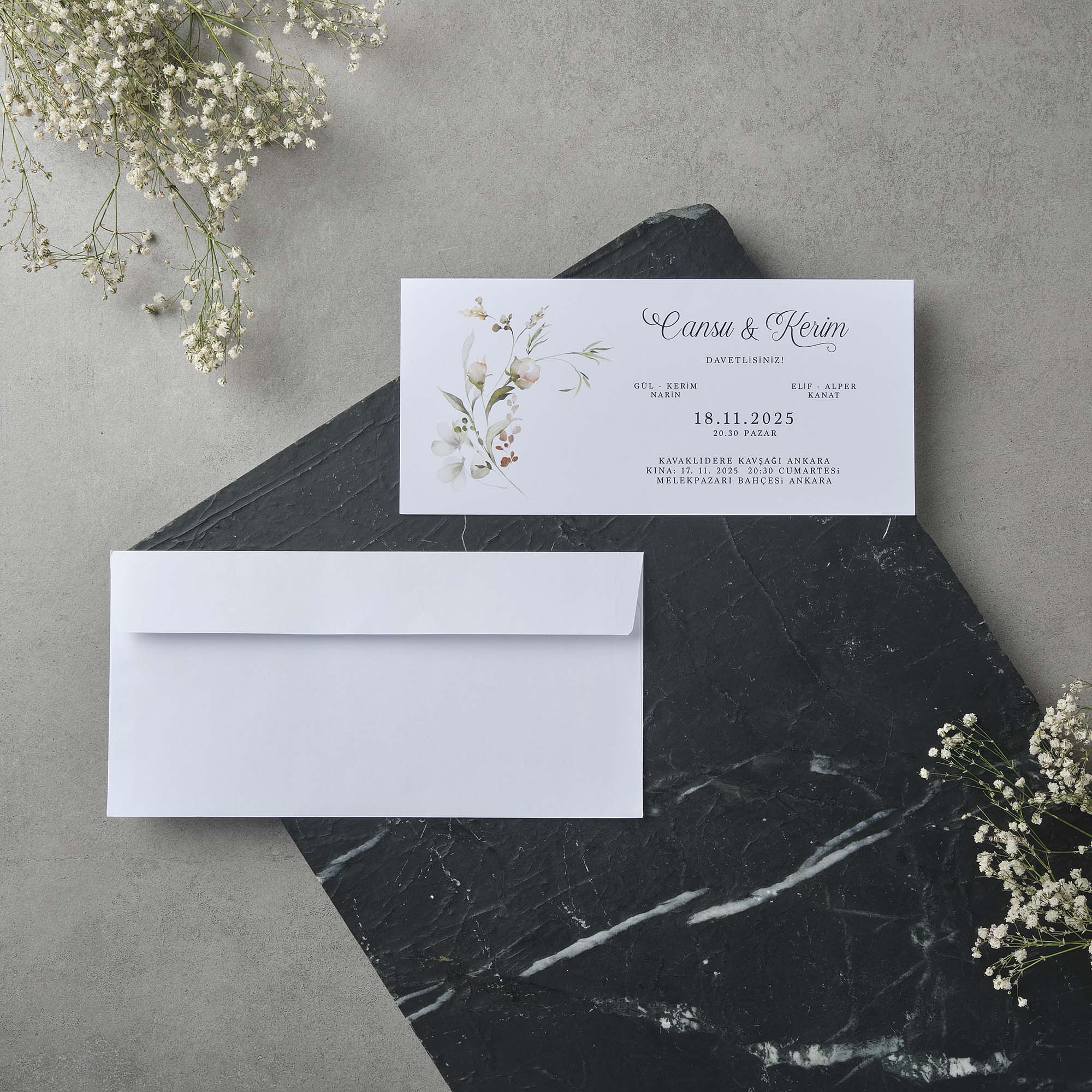• Davetiye kutulu olarak tasarlanmış olup zarf ve aksesuarları içerisinde bulunmaktadır.
