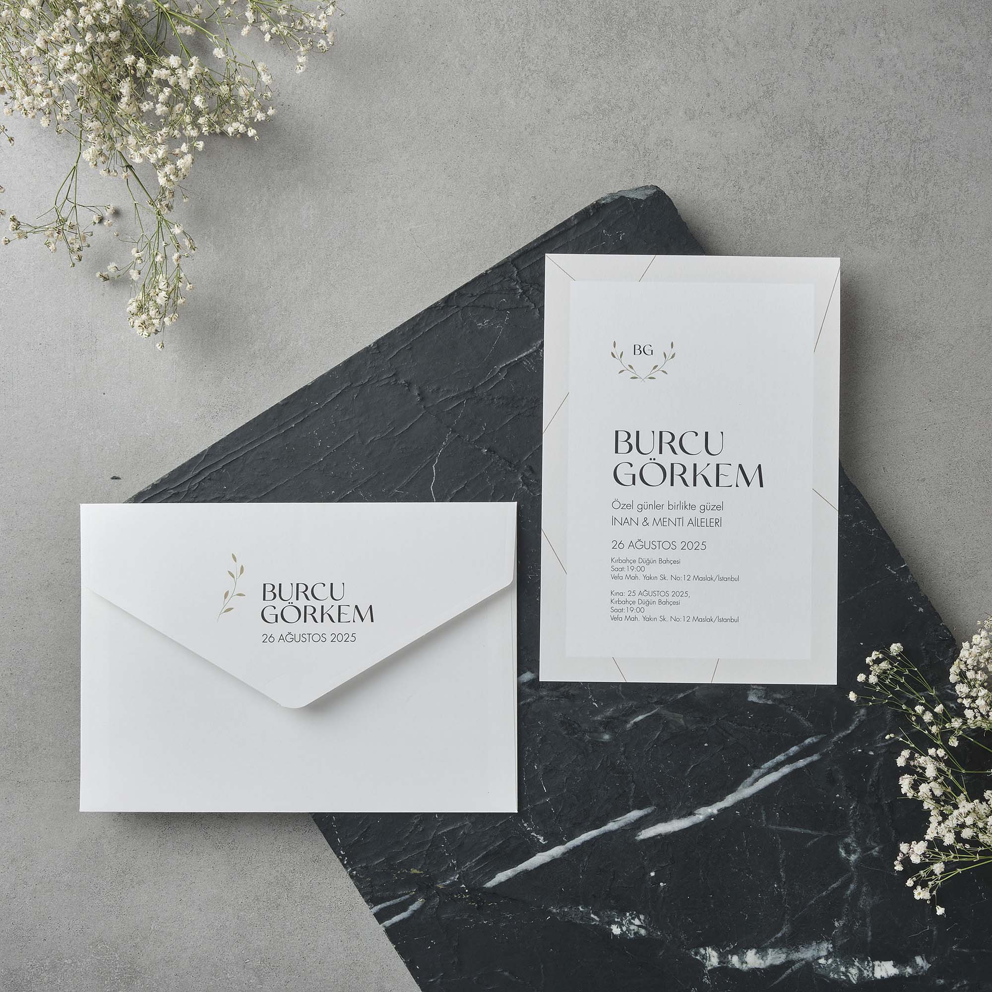 • Davetiye kutulu olarak tasarlanmış olup zarf ve aksesuarları içerisinde bulunmaktadır.
