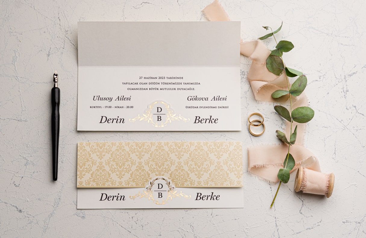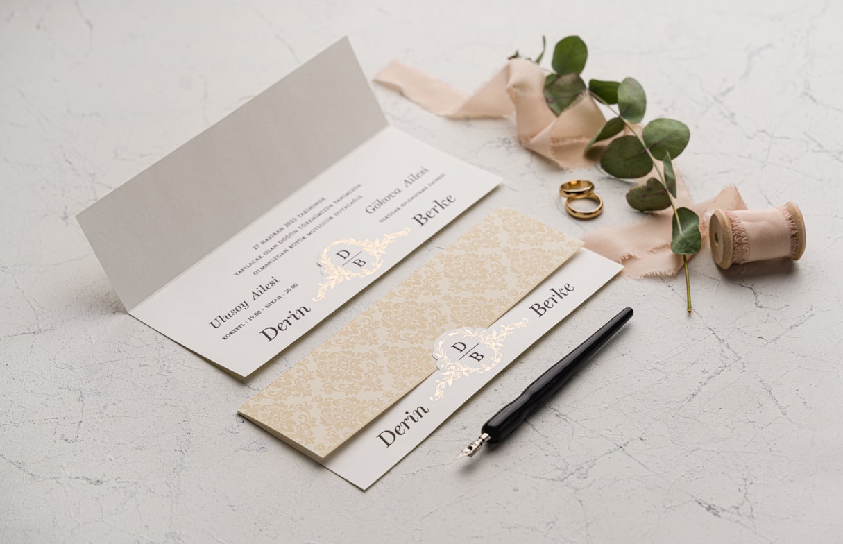 Davetiye Ofset, Varak Yaldız ve Serigraf Boya baskı tekniğine uygun olup, baskı fiyatı ayrı olarak ücretlendirilir.