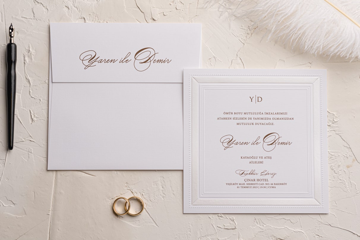 Davetiye Ofset, Varak Yaldız ve Serigraf Boya baskı tekniğine uygun olup, baskı fiyatı ayrı olarak ücretlendirilir.