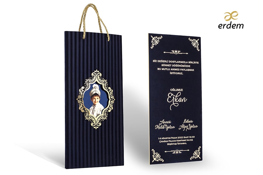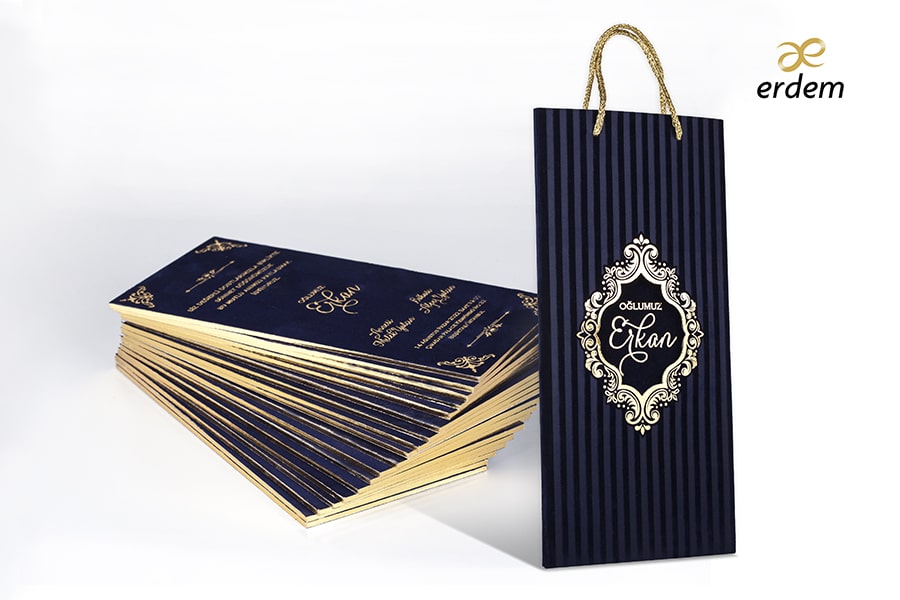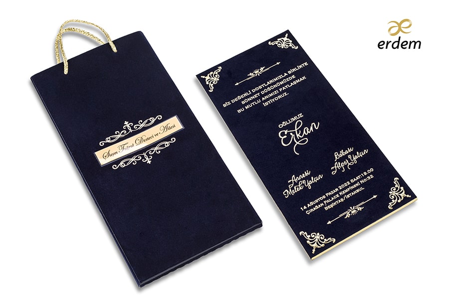 Özel Lacivert Kadife Baskılı Davetiye, Varak Yaldız baskı tekniğine uygun olup, baskı fiyatı ayrı olarak ücretlendirilir.