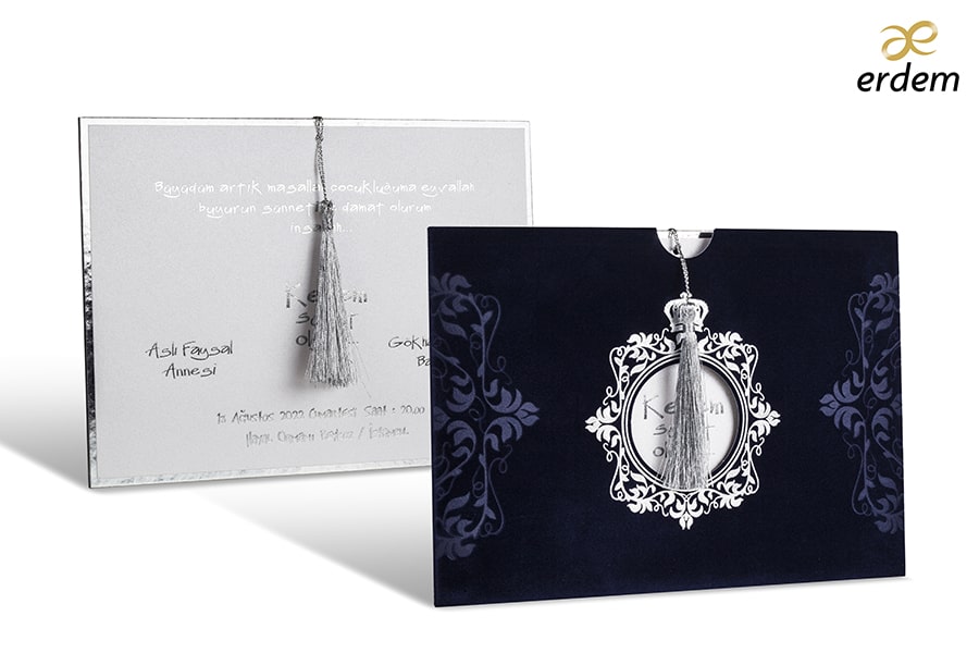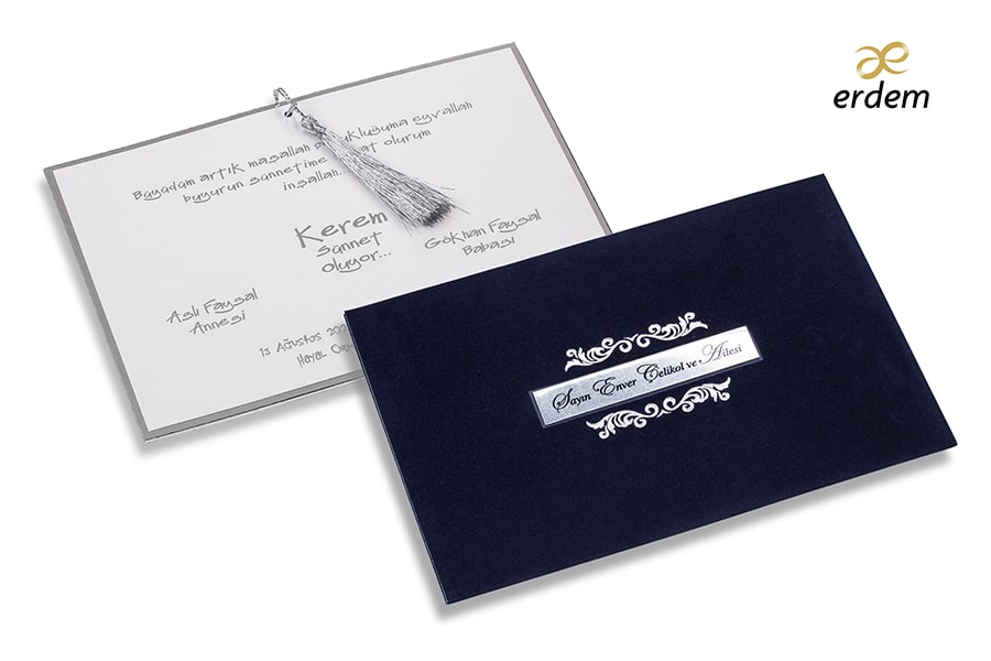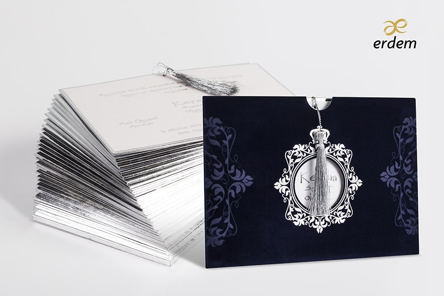 Özel Kadife baskılı davetiyeye isteğe bağlı olarak metal isimlik talep edebilirsiniz, fiyat ayrı olarak ücretlendirilir.